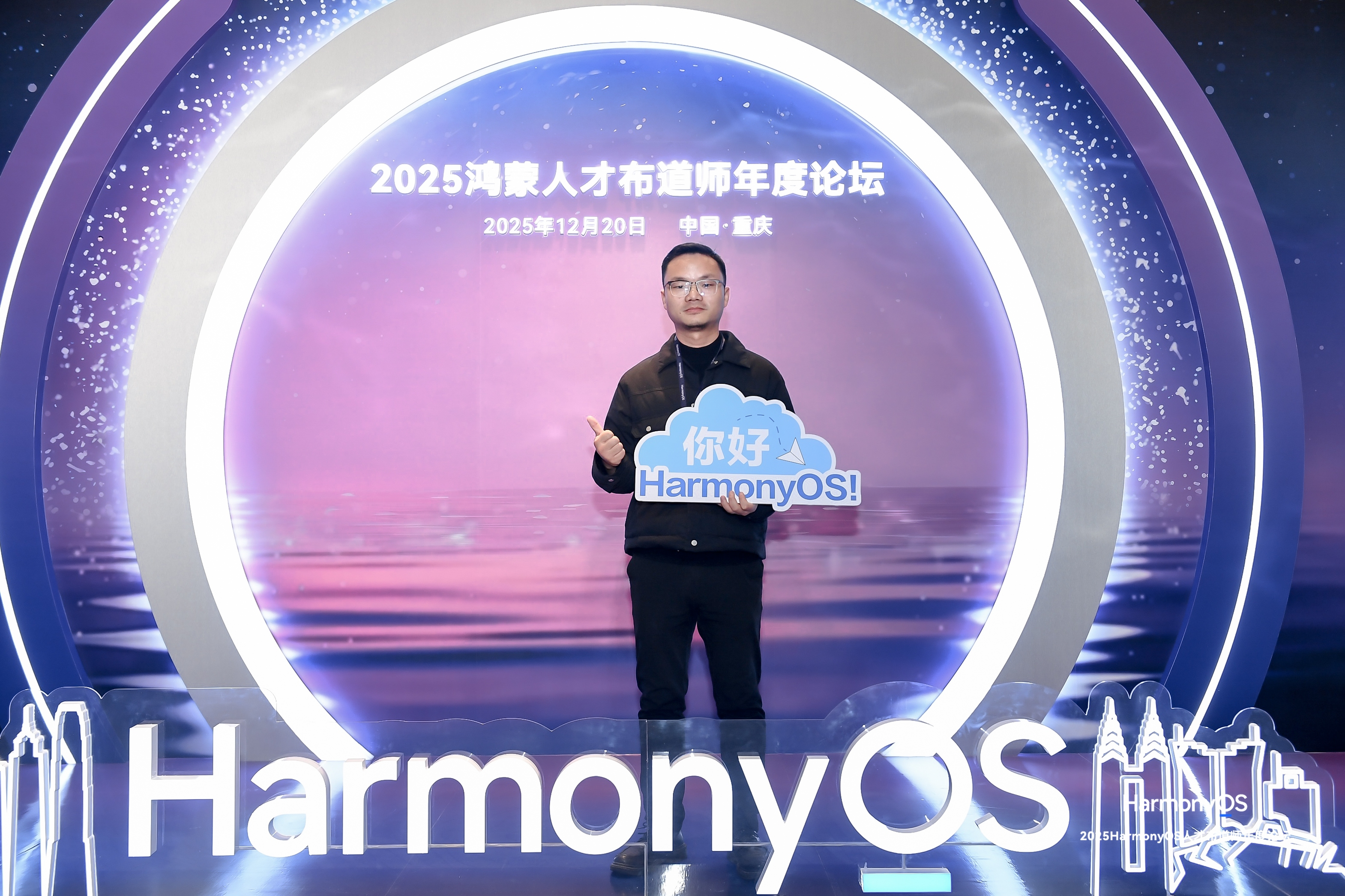 12月20日,“2025 HarmonyOS人才布道师年度论坛”在重庆顺利召开。本次论坛既是2025年度HarmonyOS人才发展成果的集中展示窗口,更是汇聚产业界、教育界、开发者社区多方智慧,共探万物智联时代人才培养新范式的思想盛会。来自全国的数百位高校教师、华为开发者专家(HDE)、华为开发者社群(HDG)组织者、培训机构讲师及鸿蒙生态建设者齐聚一堂,共同回顾鸿蒙人才生态的成长历程,表彰年度杰出贡献者,就深化产教融合、加速高质量人才培育等核心议题展开深度研讨。下图为原信数据总经理杨景文受邀参加论坛并留影。